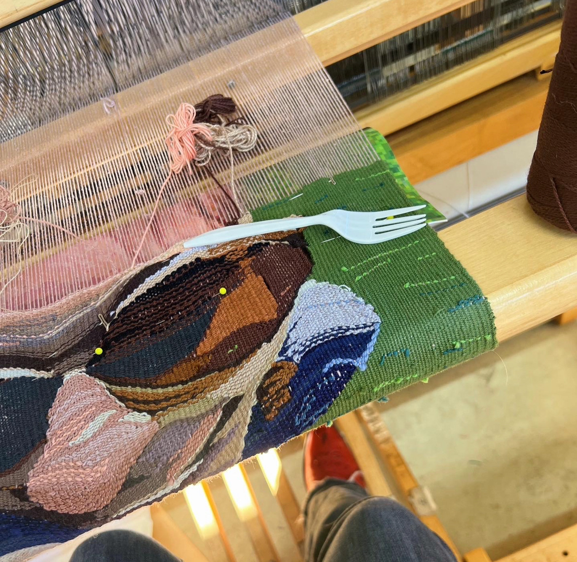 Handwoven tapestry, sublimation printed fabric, dyed cotton, polymer clay, beads, charms, bias tape, and embroidery floss